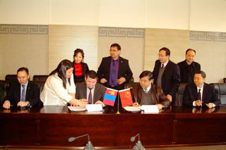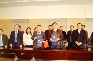 | 蒙古國執(zhí)行機(jī)構(gòu)汽車運輸局副局長納?普恩查格(前排左三) 學(xué)校副校長齊木德道爾吉(前排右二)學(xué)院院長柴金義(前排右一)簽署協(xié)議 | 合影 |