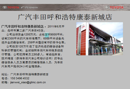 呼和浩特康泰豐田汽車(chē)銷(xiāo)售服務(wù)有限公司 |