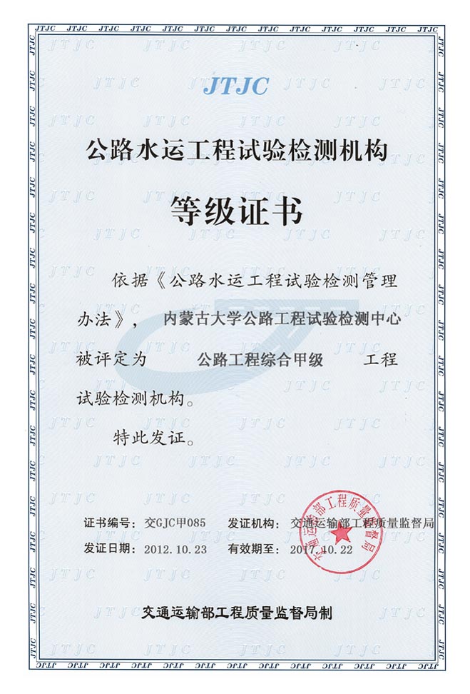 10月23日,交通運(yùn)輸部工程質(zhì)量監(jiān)督局正式向內(nèi)蒙古大學(xué)公路工程試驗(yàn)檢測(cè)中心頒發(fā)了“公路工程綜合甲級(jí)”資質(zhì)證書。內(nèi)蒙古大學(xué)公路工程檢測(cè)中心成為自治區(qū)第一家公路工程綜合甲級(jí)檢測(cè)機(jī)構(gòu),從而填補(bǔ)了自治區(qū)交通行業(yè)綜合甲級(jí)檢測(cè)機(jī)構(gòu)的空白。試驗(yàn)檢測(cè)中心獲得綜合甲級(jí)資質(zhì),是內(nèi)蒙古大學(xué)交通學(xué)院實(shí)驗(yàn)室建設(shè)的一項(xiàng)標(biāo)志性成果,將為學(xué)院教學(xué)、科研、技術(shù)服務(wù)提供良好平臺(tái),為密切與交通行業(yè)企業(yè)的合作創(chuàng)造便利條件,也為學(xué)院師生創(chuàng)新發(fā)展提供難得機(jī)遇。