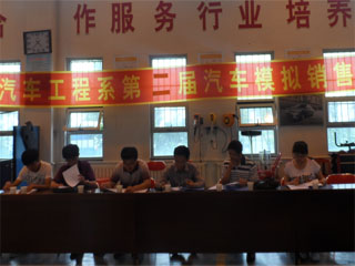 為了豐富學院大學生的課余生活,展示當代大學生的精神面貌及自身素質(zhì),培養(yǎng)大學生把理論運用于實踐的能力,我院汽車工程系在豐田實驗室舉辦“第二屆汽車模擬銷售大賽”。 汽車工程系副主任李政、黨總支書記鐘懷軍、主任助理李春芾、學工辦主任姚延剛、學生會主席孫榮欣擔任大賽評委。