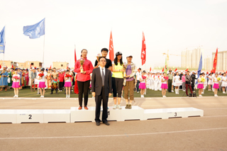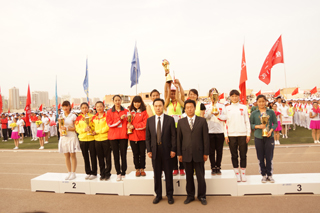 與會(huì)領(lǐng)導(dǎo)為獲得學(xué)生女子團(tuán)體前六名的單位頒獎(jiǎng) |
