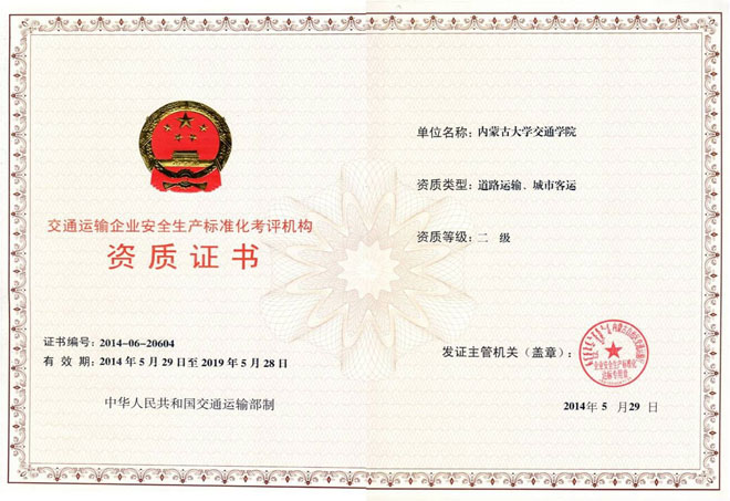 根據(jù)《內(nèi)蒙古自治區(qū)交通運(yùn)輸廳關(guān)于公布第二批交通運(yùn)輸企業(yè)安全生產(chǎn)標(biāo)準(zhǔn)化考評(píng)機(jī)構(gòu)的通知》,我院于2014年5月30日被認(rèn)定為自治區(qū)第二批交通運(yùn)輸企業(yè)安全生產(chǎn)標(biāo)準(zhǔn)化二級(jí)考評(píng)機(jī)構(gòu),承擔(dān)自治區(qū)范圍內(nèi)道路運(yùn)輸與城市客運(yùn)類企業(yè)的安全生產(chǎn)標(biāo)準(zhǔn)化建設(shè)二級(jí)達(dá)標(biāo)考評(píng)工作,資質(zhì)證書的有效期五年。目前自治區(qū)交通運(yùn)輸廳已批準(zhǔn)成立4家二級(jí)考評(píng)機(jī)構(gòu),負(fù)責(zé)對(duì)道路運(yùn)輸、城市客運(yùn)、交通運(yùn)輸工程建設(shè)等5個(gè)專業(yè)類型的企業(yè)進(jìn)行安全生產(chǎn)標(biāo)準(zhǔn)化建設(shè)達(dá)標(biāo)考評(píng)。