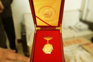 圖為中央軍委頒發(fā)的“紀念中國人民抗日戰(zhàn)爭暨世界人民反法西斯戰(zhàn)爭勝利70周年”金質(zhì)紀念章 |