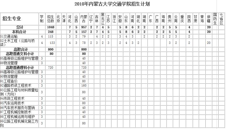 2010內(nèi)蒙古大學(xué)交通學(xué)院招生計(jì)劃