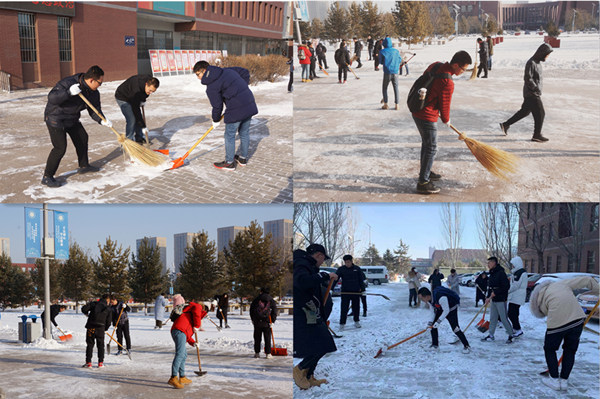 今冬呼和浩特的初雪在上周末如約而至,校園內(nèi)銀裝素裹,分外妖嬈,白雪覆蓋了整個校園,為校園平添了新的色彩,但同時(shí)校園道路積雪也給師生出行帶來了安全隱患。為盡快消除積雪影響,方便師生出行,方便師生出行,12月2日上午,學(xué)院團(tuán)委、就業(yè)指導(dǎo)中心組織學(xué)生會、就業(yè)創(chuàng)業(yè)促進(jìn)會、國旗班、軍樂團(tuán)、心理健康教育中心等部分學(xué)生干部和卓越工程師班的同學(xué)們開展義務(wù)掃雪活動。