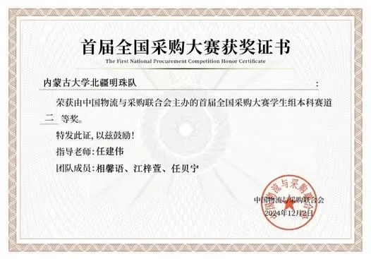 2024年12月1-2日,中國物流與采購聯(lián)合會(huì)主辦,深圳交易集團(tuán)有限公司和中國石油物資有限公司承辦,深圳交易研究院有限公司和北京物資學(xué)院共同協(xié)辦的首屆全國采購大賽決賽及頒獎(jiǎng)典禮在深圳舉行。由我院運(yùn)輸工程系任建偉教授指導(dǎo),相馨語(物流2202班)、江梓萱(物流2202班)、任貝寧(物流2202班)組成的“北疆明珠隊(duì)”榮獲全國二等獎(jiǎng)。